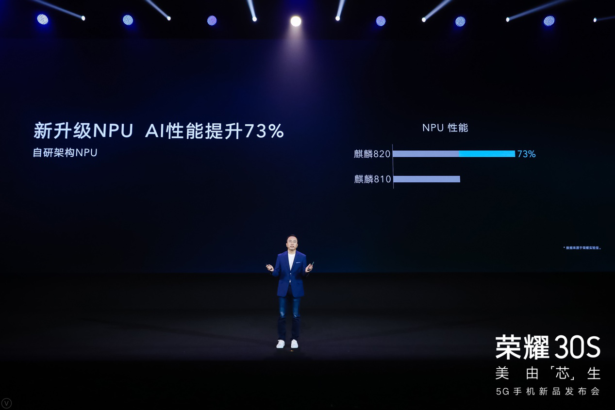 作为荣耀手机的一贯优势,荣耀 30S 的 AI 算力也获得全新升级。麒麟 820 搭载全新升级的华为自研架构 NPU,AI 算力大幅提升同时还具备卓越 AI 能效。AI-Benchmark 测试结果显示,荣耀 30S 成绩达到 60834 分,较搭载麒麟 810 的荣耀 20S 提升 73%。