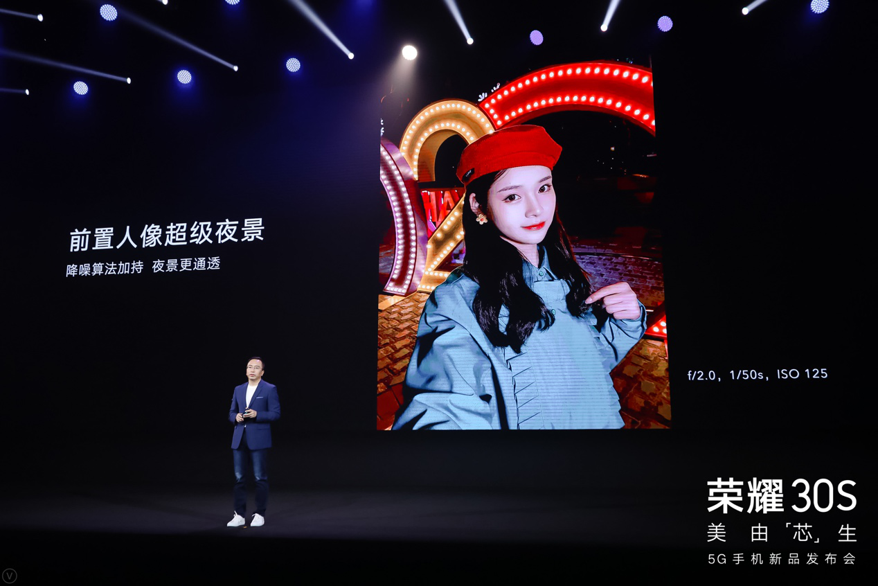 荣耀 30S 前置 1600 万像素 AI 自拍摄像头,搭载全新 AI 美颜方案。AI 亮眼算法能够捕捉眼神,明亮双眼,拒绝千篇一律的美颜方案,实现千人千面的美颜效果。此外,荣耀 30S 也支持新一代人像超级夜景模式,带来夜景自拍新体验,夜色下也能获得观感极佳的自拍样张。