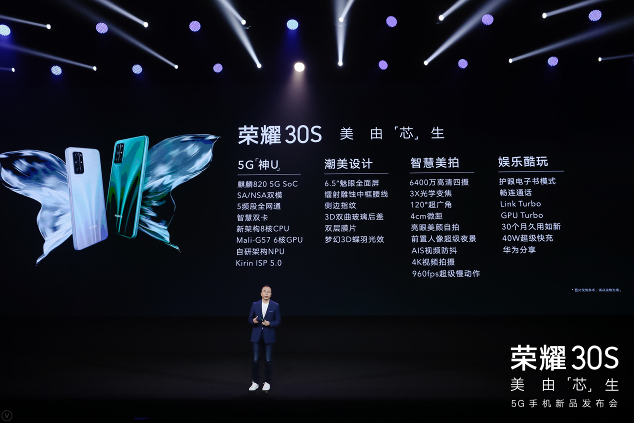 荣耀 30S 这一深具爆款潜质的产品,充分凸显荣耀成功的底层密码:技术、品质、产品力三大元素之间发生化学反应,带来日益强大的市场穿透力与影响力。面向 5G 智能物联时代,以 5G 手机普及主导者荣耀 30S 的发布作为新起点,荣耀继续为科技探索创新方向,为用户探索创新乐趣。荣耀 30S,不止是荣耀 5G 布局的关键,更立足于全新一代自研芯片麒麟 820,将通过技术上的降维打击,掀起一场 5G 普及风暴,重塑市场格局,让更多用户感受到 5G 的真正魅力,引领 5G 手机换机热潮。荣耀正以用户陪伴者、行业引领者、市场收割者的姿态,搅起纵深「聚变」,以非凡引领力,为下一个科技新纪元带来巨大想象力。