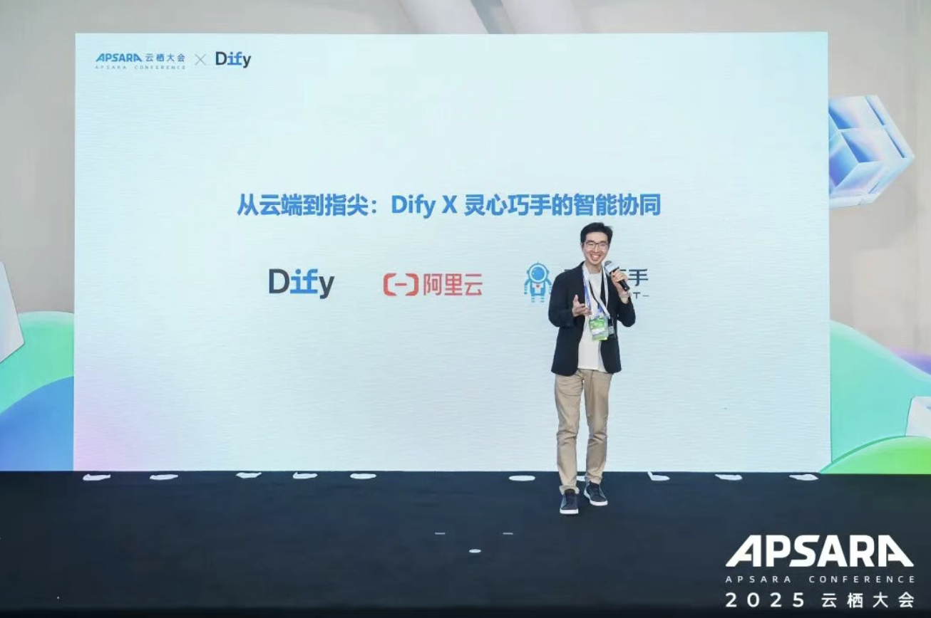 在 Nexus 产品生态峰会现场,Dify 展示了与阿里云共同构建生产级 Agent AI 开发平台后,其客户灵心巧手灵心巧手联合创始人苏洋,也上台分享了与 Dify 合作落地大模型的经验,目前灵心巧手已开发出能承重 30 公斤、设计寿命达 200 万次的机器人手|图片来源:阿里云