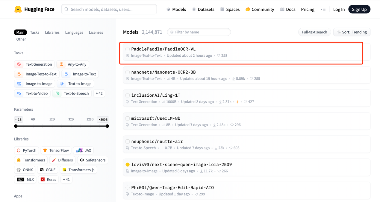 10 月 17 日消息,HuggingFace 官网显示,百度昨晚发布的自研多模态文档解析模型 PaddleOCR-VL,发布 20 小时内即登顶 HuggingFace Trending 全球第一。