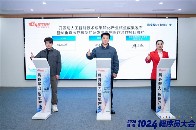 随后,CSDN、武汉昇腾人工智能创新中心、武汉市德发电子信息有限责任公司三方签署开源与人工智能技术成果转化产业试点合作协议。