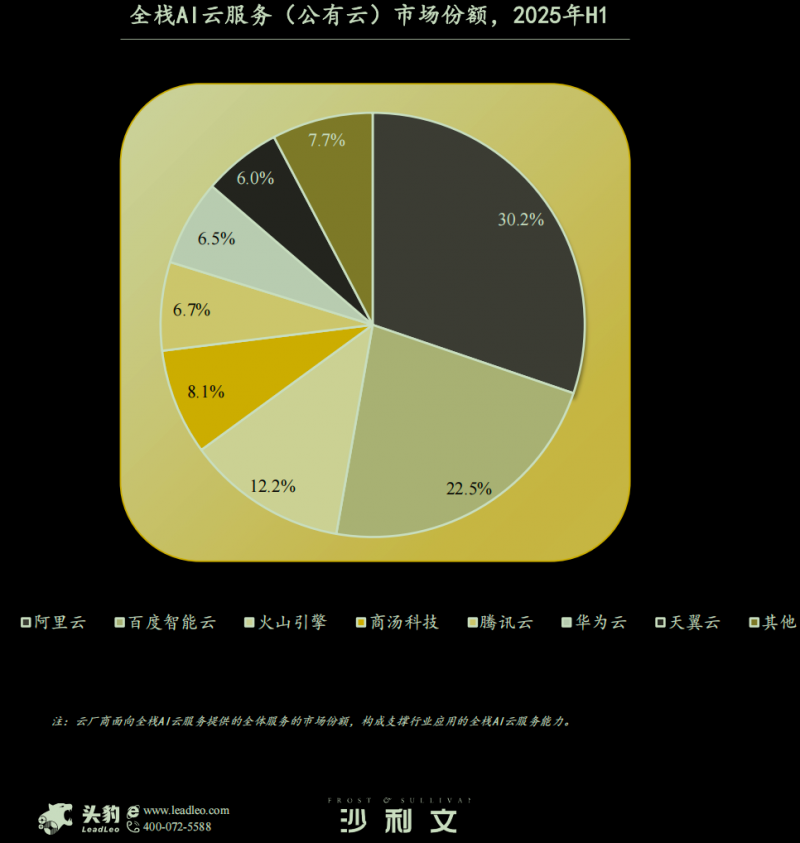 10 月 27 日消息,国际权威咨询机构弗若斯特沙利文沙利文发布《中国全栈 AI 云服务(公有云)市场报告 2025H1》报告。数据显示,2025 年上半年,中国全栈 AI 云服务市场规模达 259 亿元,其中阿里云以 30.2% 市场份额位居第一,百度智能云以 22.5% 的市场份额位居第二。两家合计份额占比超 50%,中国 AI 云双雄格局日渐成型。