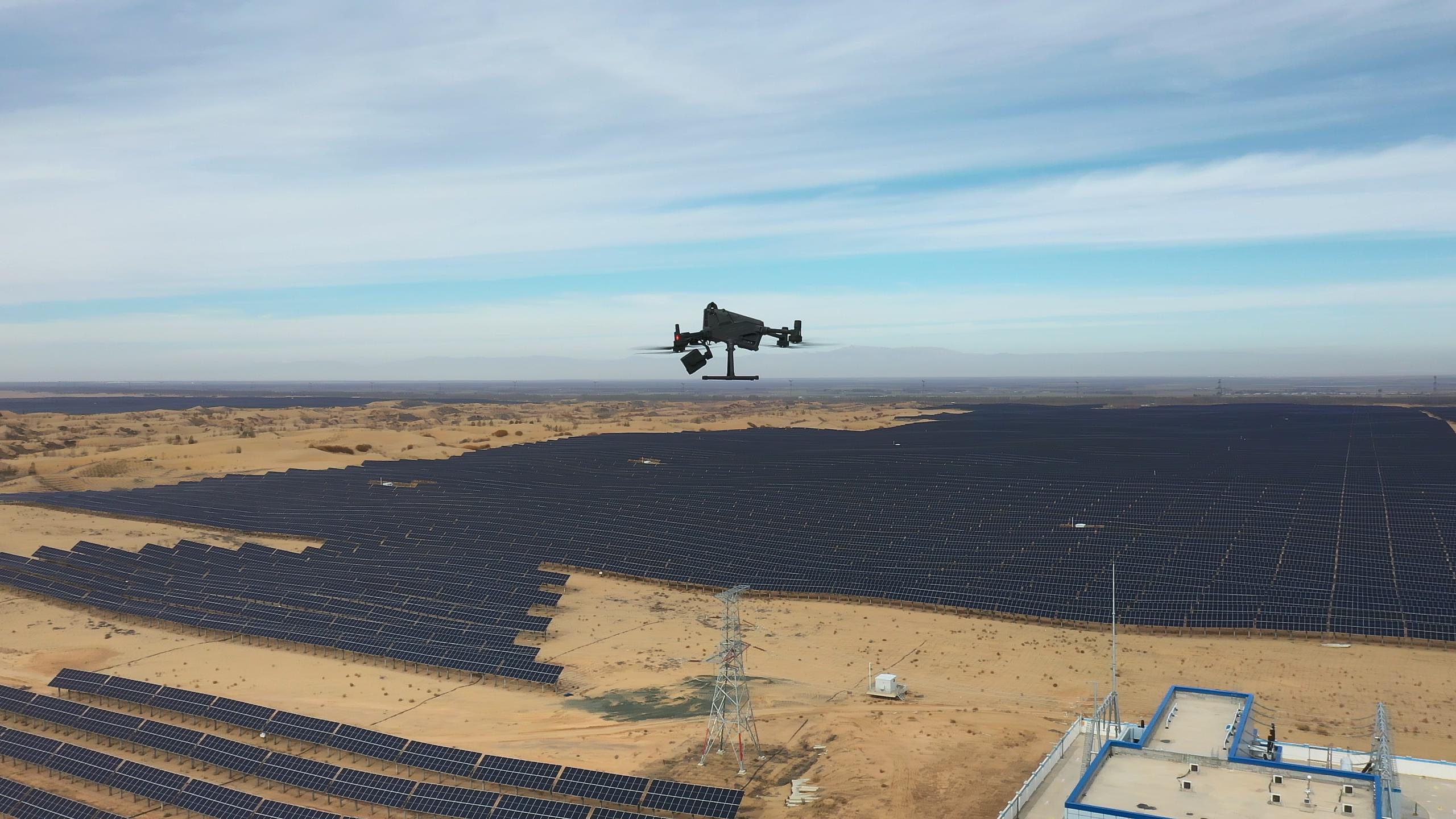在这片「光伏发电+牧草种植+畜牧业」的循环经济试验田,无人机持续观测提供的定量资料,为治沙成效评估、植被配置优化提供了详实的数据支撑。它守护的不仅是每一度绿电,更是沙漠中来之不易的「新生」。