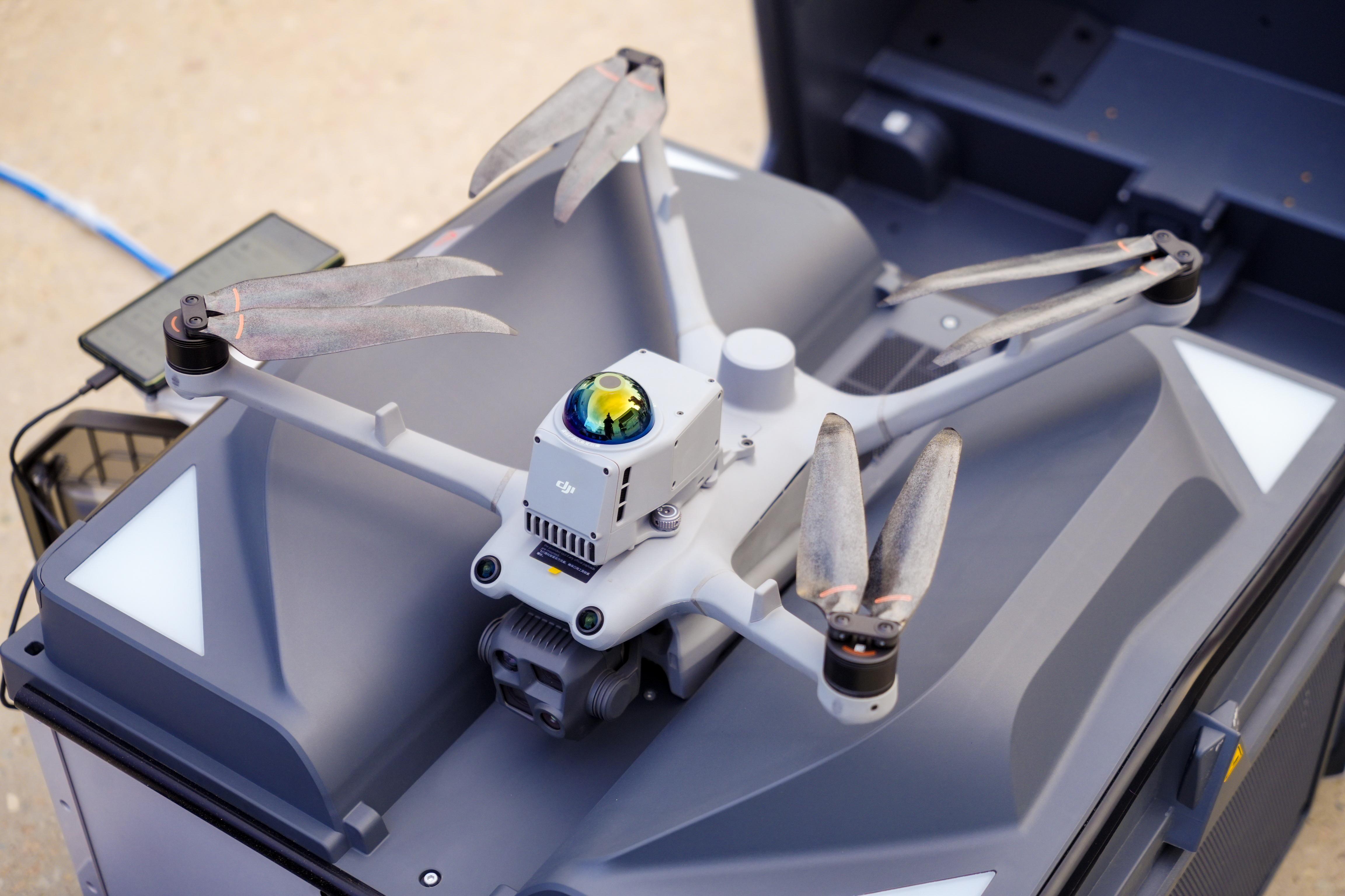 在活动现场,大疆工程师汤秋枫演示了这套方案的「杀手锏」——自动化。这套方案的核心是「大疆机场 3」无人机自动机库。工程师在后方控制室轻点鼠标下达任务,机库便自动打开,无人机(如 Matrice 4TD)自主起飞、按照规划航线巡检、采集数据、自动返航并降落充电,最后自动生成分析报告。