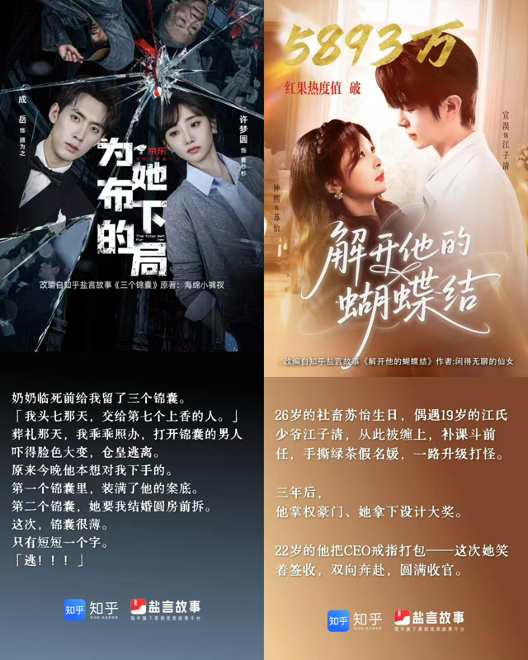 作为以精品化著称的盐言故事,一直不断向短剧、微短剧领域输送优质文本。随着越来越多改编短剧爆款出圈,盐言故事作为短剧产业的优质剧本池的行业价值正在不断夯实,甚至被誉为剧本层面的「短剧爆款制造机」。几乎与《千金谋》爆火同时,由盐言故事小说改编的另外两部短剧佳作《为她布下的局》《解开他的蝴蝶结》也一路高热,引领「盐言系短剧」热潮。