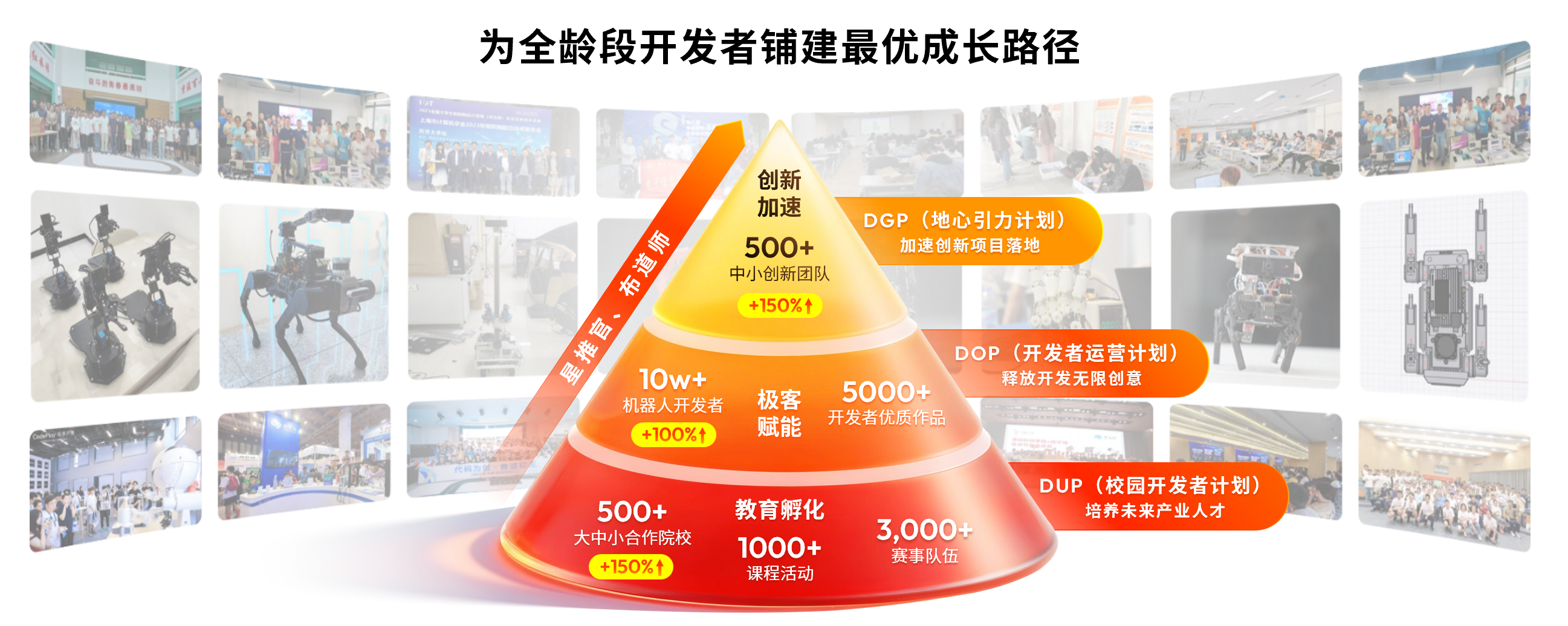 在RDK生态成果方面,地瓜机器人实现「一横一纵」加速拓展,横向已遍布亚太、欧洲和北美20多个国家,纵向覆盖全年龄段,迄今已服务超10万机器人开发者,较去年同比增长100%。其中,地瓜机器人面向创业公司打造的全球生态创新项目DGP地心引力计划,已赋能500+中小创新团队实现项目落地,较去年同比增长150%,助力朗极智能、卢登斯智能、恒之未来、巡领科技、睿亚极光等优秀创新企业产出多个优秀项目。