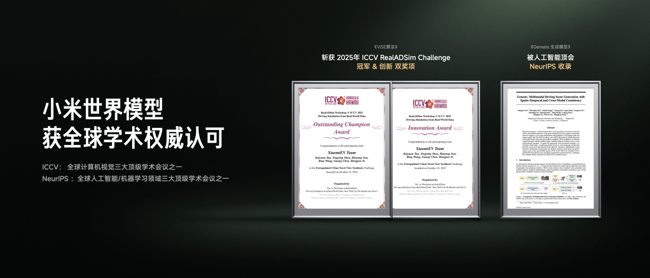 小米世界模型已获得全球学术权威的充分认可:小米的 ViSE 算法在 ICCV 2025 - 自动驾驶方向仿真合成数据专业挑战赛中荣获冠军;小米生成模型的相关论文被 NeurIPS 所收录。ICCV 是全球计算机视觉三大顶级学术会议之一,NeurIPS 是全球人工智能/机器学习领域三大顶级学术会议之一。