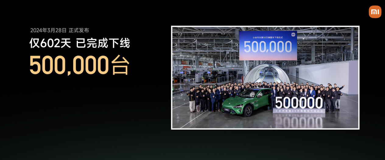 与此同时,从 2024 年 3 月 28 日小米 SU7 正式发布以来,我们仅用 602 天,就下线了 50 万台小米汽车。截至 2025 年 11 月 20 日,小米汽车是全球范围内最快达成这一成绩的车企,这是中国速度的新纪录,也是世界汽车工业的里程碑。按照这一节奏,预计本周内就能提前完成全年 35 万台交付目标,小米汽车将持续为用户带来更好的产品和更好的体验。