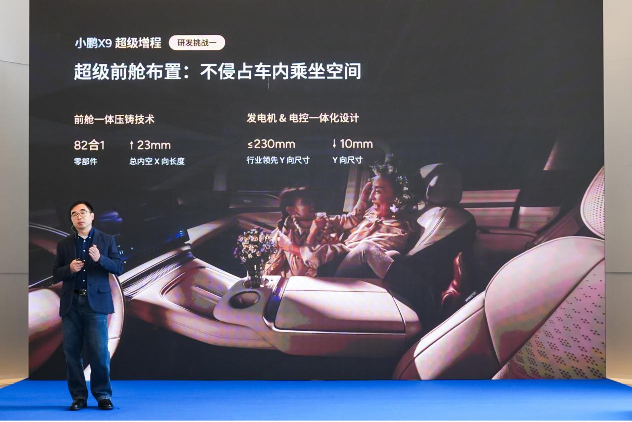 在联合研发攻坚战中,首先要面对的是挑战布置空间,小鹏X9超级增程如何实现行业最高集成度,不侵占座舱空间?小鹏 X9 超级增程前舱布局紧凑,在不压缩座舱乘坐空间的前提下,小鹏汽车与华为选择通过发电机与电控的高集成度设计,将发电机 Y 向尺寸极致压缩至≤230mm。结合小鹏汽车的前舱一体压铸技术,实现零部件 82 合⼀,总内空 X 向⻓度提升 23mm,共同实现了前舱空间利用率的行业突破。