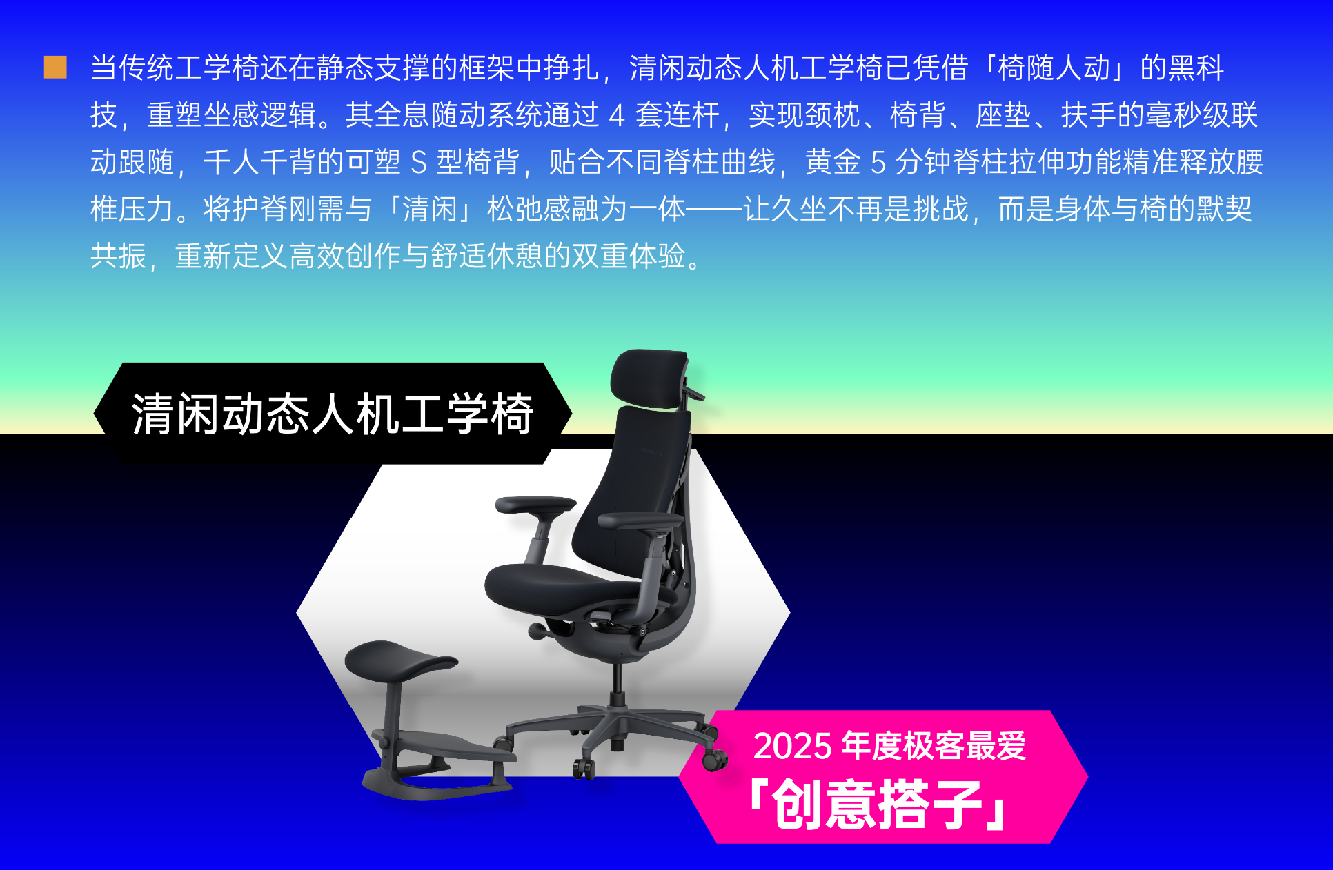 值得一提的是,此次斩获「2025 年度极客最爱创意搭子」奖项,与清闲智能「为创造 而创造 Create For Creators」的品牌 slogan 深度共鸣。「创意搭子」精准锚定极客、设计师等创造者群体需求,而清闲以动态人机工学技术打破久坐束缚,让创造者专注创意本身,以「创造」赋能「创造」,正是其成为极客心中最佳创意搭子的核心原因。未来,清闲智能将持续深耕动态人机工学技术,拓展更多健康办公场景解决方案,让中国创新技术为全球用户提供更科学的健康办公保障。