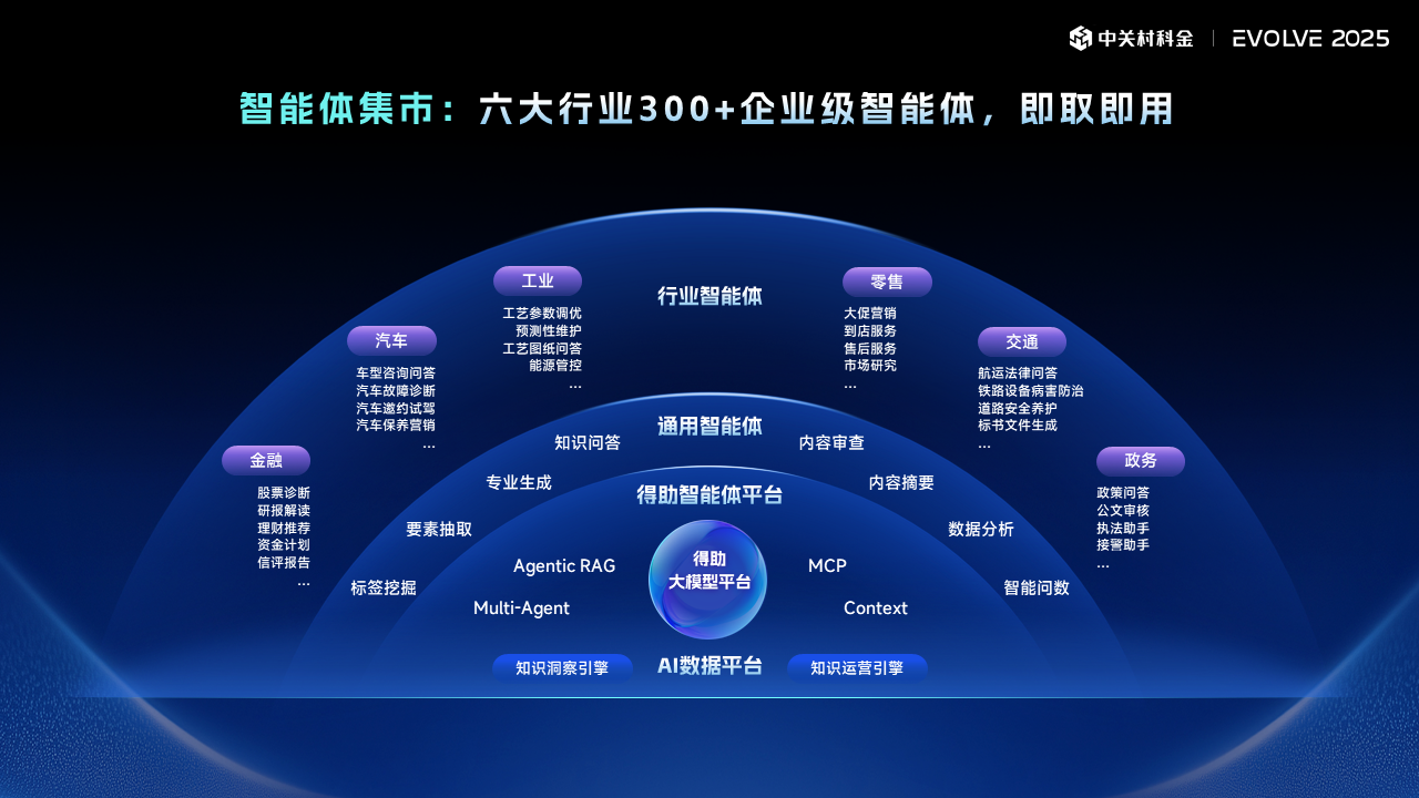 在技术平台层,中关村科金正式发布得助大模型平台5.0,它是高效构建企业级智能体的全能基座,帮助企业更快、更好落地AI创新。全面升级的智能体集市,集成了金融、工业、汽车、零售、交通、政务六大行业超过300个智能体,即取即用,让企业可以快速进行场景验证,更加聚焦创新而非基础建设。同时,得助大模型平台5.0强化智能体开发运维全链路能力,升级迭代知识引擎、智能体开发、效果评测、部署运维、运行监测、效果优化等十多项能力,有效保障企业场景落地成功率超过95%。