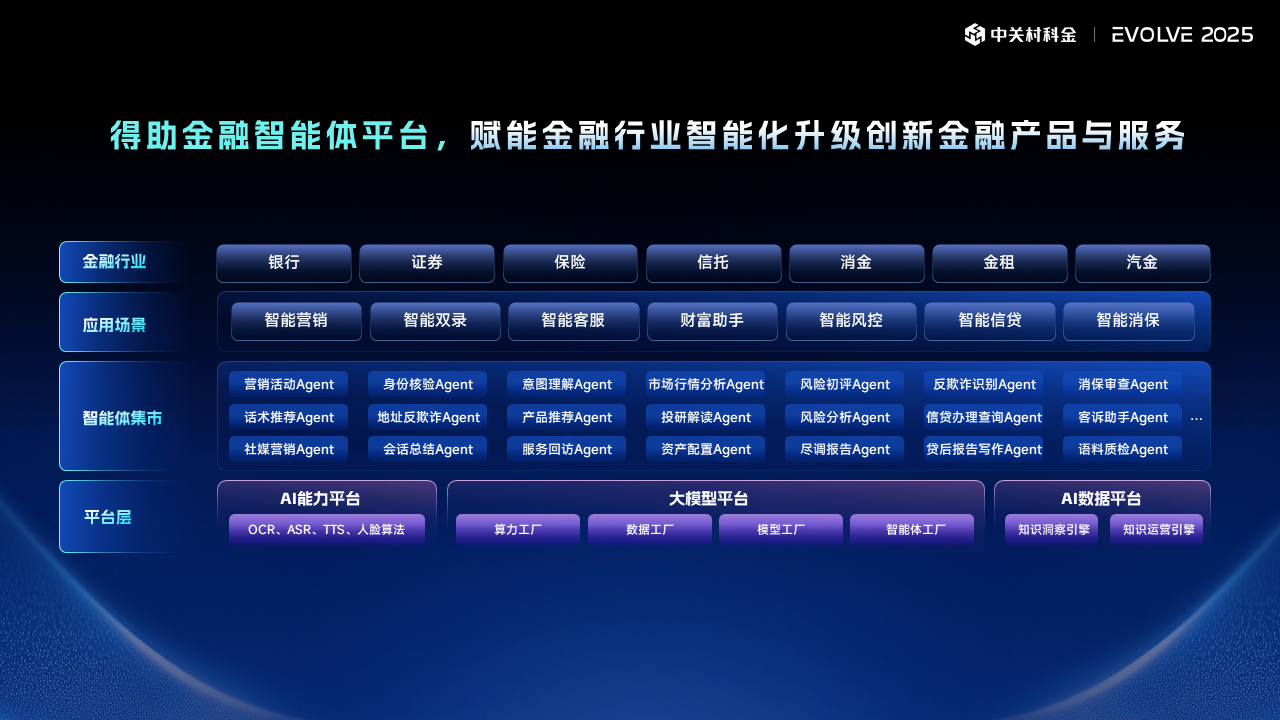 除了面向营销服和企业办公场景的通用应用平台,中关村科金还推出面向金融和工业两大领域的行业智能体平台,提供更具行业针对性的综合解决方案。