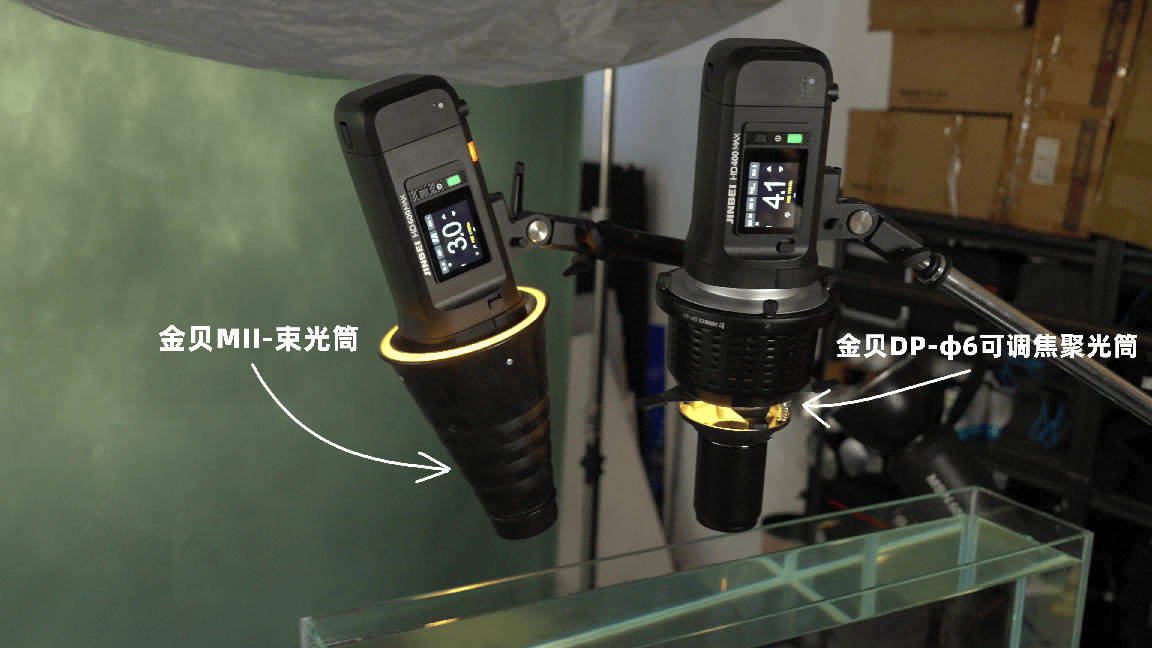 博主光学作用选择再加上两盏金贝外拍闪光灯 HD 600MAX 和 HD 400MAX, 分别搭配了 MII-束光筒和 DP-φ6 可调焦聚光筒。用来在玻璃水缸上方聚拢光线穿透水面, 形成清晰的光束轨迹。开启这两盏灯的高速定格模式, 同时倒入适量牛奶, 借助牛奶的胶体特性让光线出现丁达尔效应, 这正是深海耶稣光的核心秘诀。