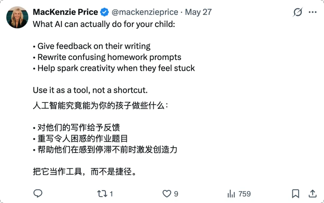第二,关注孩子「使用 AI」的方式。AI 可以是思考的延伸,也可以是思考的替代。前者让孩子变得更强,后者让孩子变得更弱。家长需要帮孩子建立一个意识: AI 是用来解决问题的,不是用来逃避问题的。