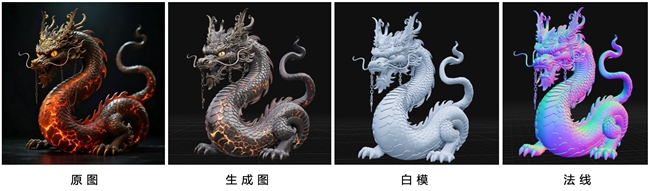 龙形模型在结构、纹理与材质上呈现高度一致性,整体盘绕姿态与体块关系清晰,鳞片、角、须等复杂细节严格依附于几何结构生成,而非简单叠加。纹理随结构同步「生长」,没有拉伸或错位。即使在灰模状态下,模型仍保持完整体积与层次,生成后即可直接进入打印与生产流程。
