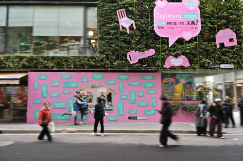 在 2025 年的最后一天, 这里仿佛成了上海「搭子」社交的缩影。从「Studyingship 学习搭子」、「ship 相互充电」, 到「hahahaship」一碰上就笑不停」——这些看似轻盈的连接, 正构筑成城市生活中真实而活跃的社交图景。年轻人专门前来打卡, 在粉色墙前驻足, 有人与同行的「搭子」合影留念, 有人在便签上写下自己的专属「ship」贴于墙面。个人的社交印记与集体的表达在此交融, 让这面墙不仅成为展览的一部分, 更成为一段正在发生的、属于当代人的关系叙事。