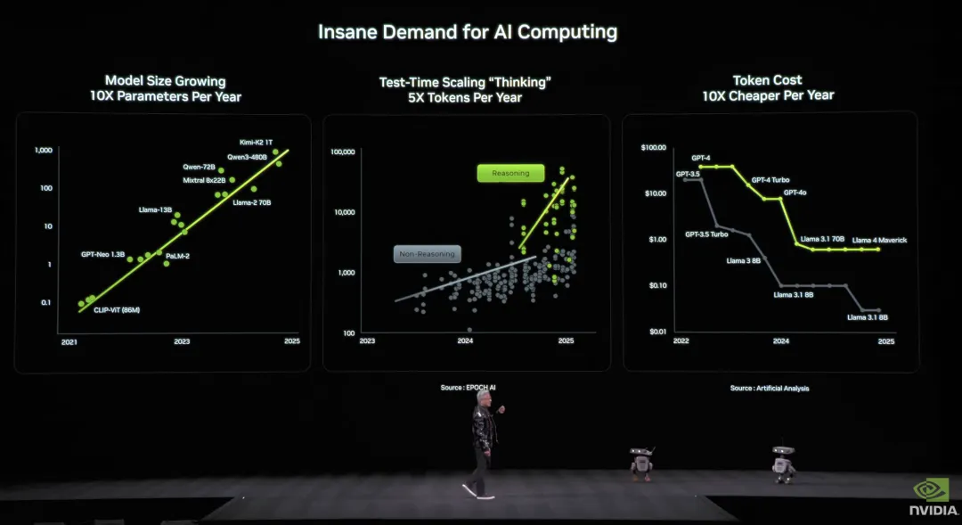 黄仁勋描述了算力需求的疯狂,模型规模每年 10 倍增长,o1 之后推理变成「思考过程」,后训练引入强化学习,计算量暴增;test-time scaling 让每次推理 token 量再涨 5 倍;而且每次冲到新前沿,上一代 token 成本会以每年 10 倍速度下跌,这反过来说明竞赛极其激烈,