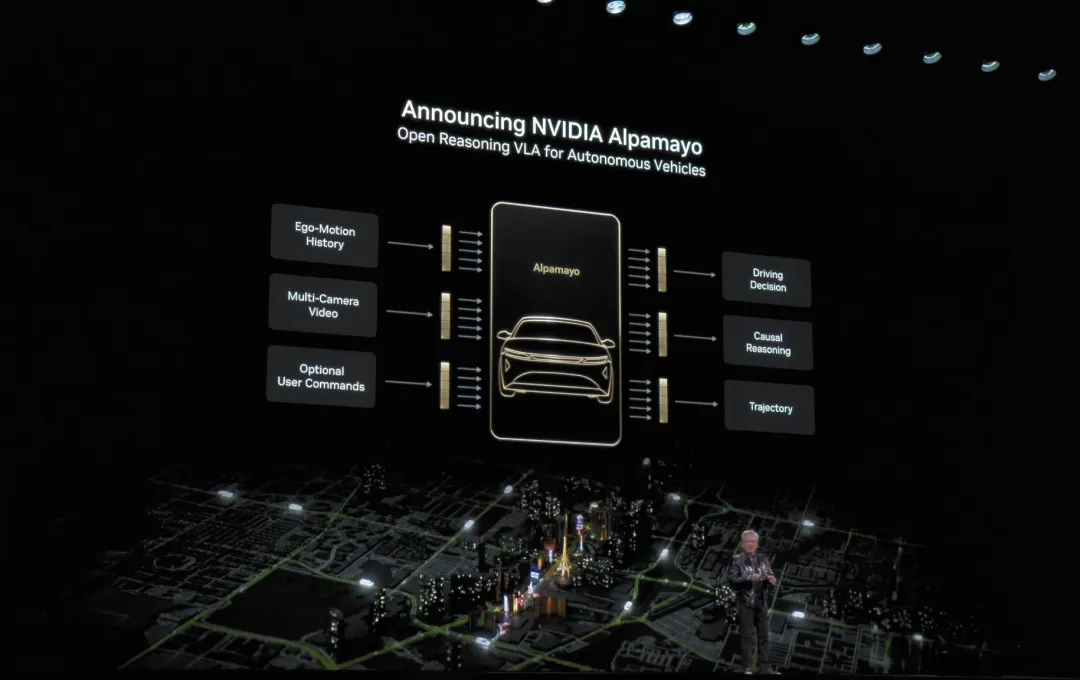 他在台上宣布了 Alpamayo,称之为「世界第一个会思考、会推理的自动驾驶 AI」。它端到端从摄像头到执行器,既学了大量真实里程的「人类示范」,也学了 Cosmos 生成的里程,再加上「几十万」极其仔细的标注样本。