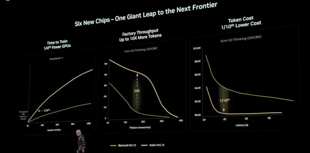 Rubin 相对 Hopper 的提升、相对 Blackwell 的再提升,被他形容成一轮接一轮的数量级跃迁,而 token 成本又能再降一个数量级,这就是他们所谓「把所有人推到下一前沿」的方式。
