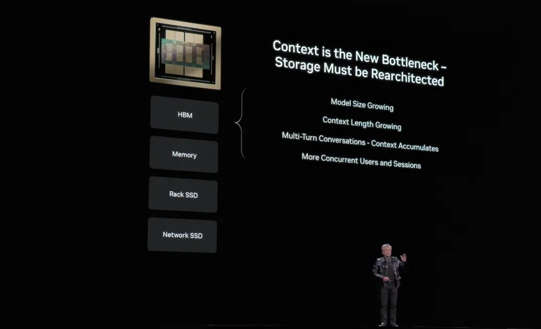 另外,英伟达还宣布推出针对 AI 上下文记忆的存储平台。模型每生成一个 token,都要读模型、读上下文、写回 cache,对话越长,上下文越大。黄仁勋称,你希望 AI 记住「一生的所有对话」,HBM 装不下了,Grace 直连 GPU 做「快速上下文内存」也不够了,继续往外走到数据中心存储又会被网络堵死。