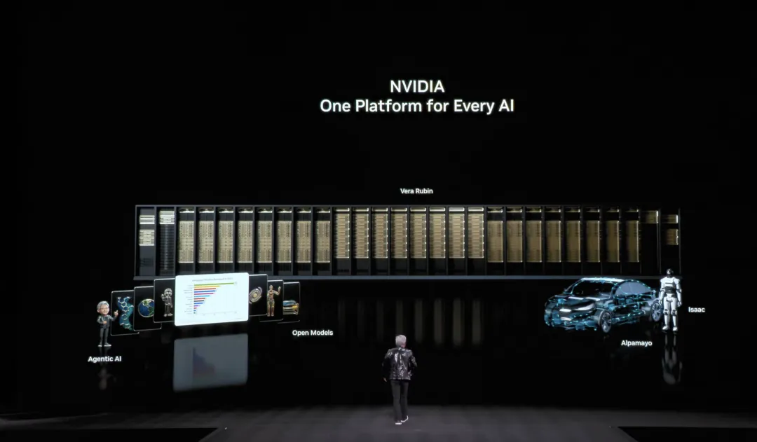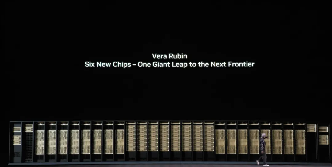 讲完产业,黄仁勋最后把话题拉回硬件,介绍 Vera Rubin。
