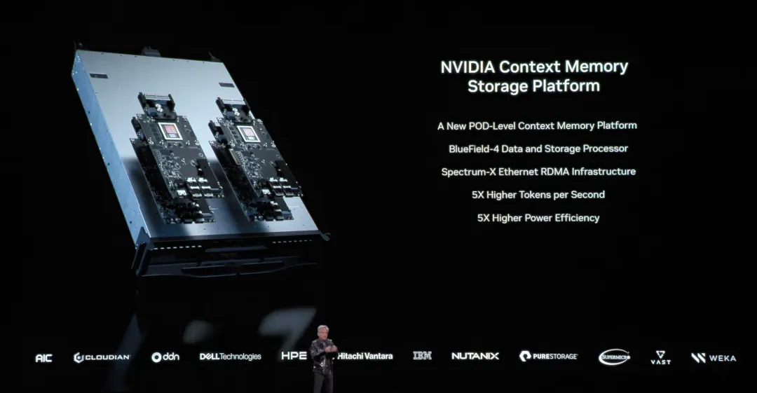 于是他们做了「机柜内的超高速 KV cache 存储」,由 BlueField 跑整套上下文管理系统,把它放得离 GPU 极近。
