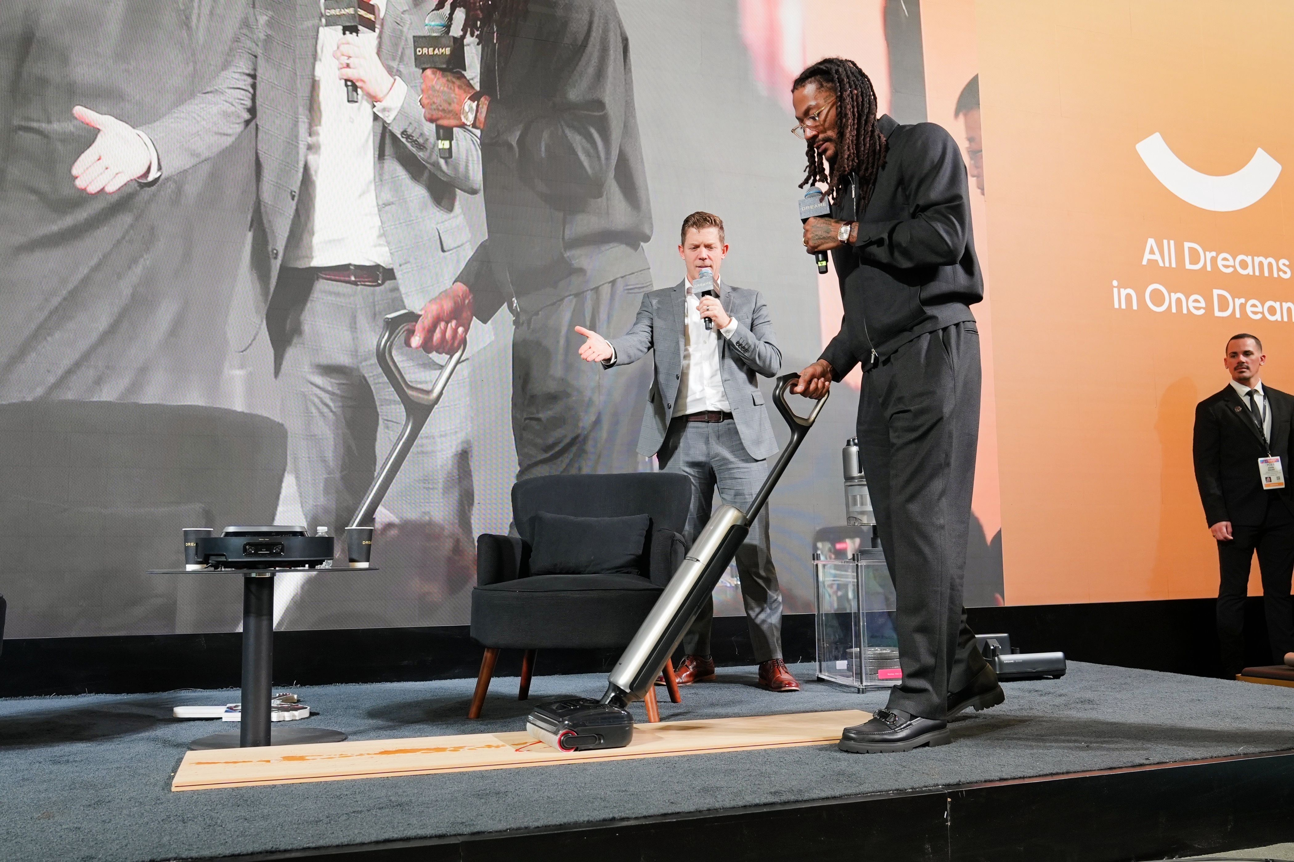 1 月 7 日,追觅洗地机展区迎来了一位特殊的体验官——NBA 传奇球星、历史最年轻 MVP 德里克·罗斯(Derrick Rose)。罗斯在现场亲自体验了多款追觅洗地机产品,对双机械臂刮洗结构及蒸汽 + 热水清洁方案留下了深刻印象。球星的到访也迅速吸引大量观众与媒体围观,成为 CES 现场的一大亮点。