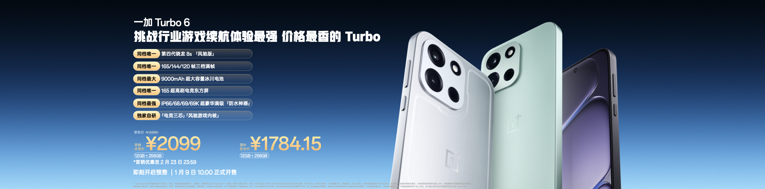 一加 Turbo 6 将于 1 月 9 日 10:00 全渠道正式开售,首销优惠价 2099 元起,国补到手价 1784.15 元起;一加 Turbo 6V 将于 1 月 9 日 10:00 全渠道正式开售,首销优惠价 1699 元起,国补到手价 1444.15 元起。