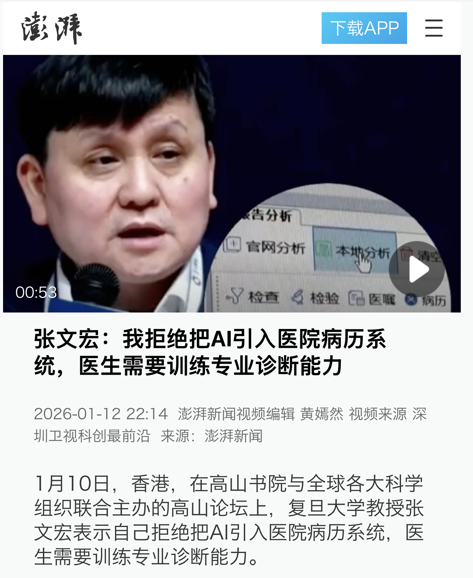 近日,复旦大学附属华山医院感染科主任、国家传染病医学中心主任张文宏教授在香港高山书院十周年论坛上的一番话,精准地触碰到了 AI 医疗发展的痛点。张文宏明确表示,他拒绝将 AI 引入其医院的病历系统。据他介绍,他个人使用 AI 的方式是让其对病例“先看一遍”,事后凭借深厚的专业经验,自己可以一看就知道 AI 哪里是错的。但一名医生若从实习阶段就未经完整的诊断思维训练,直接借助 AI 获得结论,将导致其无法鉴别 AI 诊断的正误。这种能力的缺失,是隐藏在技术便利背后的深层隐患。