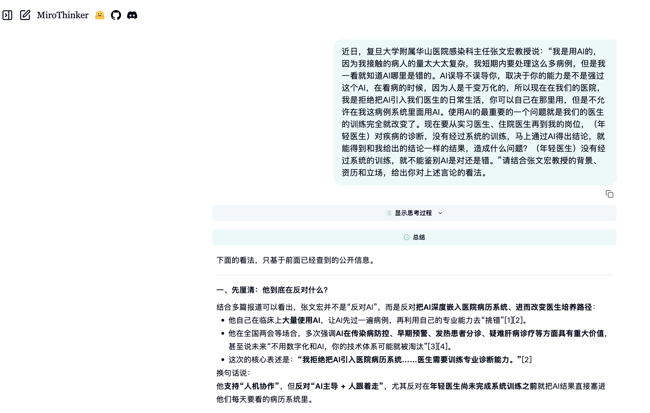 但在日常工作中,我们或许最需要的是像 MiroThinker 所展现的那种最懂提问者的“深度思考助手”。它不仅能高效检索资料,更能通过层层递进的逻辑拆解,陪着人类去“想问题”。在回答时,它在确保事实严谨和逻辑自洽的前提下,试图提醒我们回归问题的本质,并用类似人类研究者的思考方式来组织内容,与许多偏向堆砌信息或发散生成“行业报告”的模型相比,更强调思路清晰、观点有取舍、敢于在权威观点下给出建设性补充与异议。
