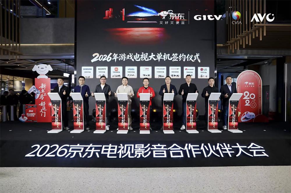 近日,2026 京东电视影音合作伙伴大会暨游戏电视标准发布&年货节启动仪式圆满结束。中国电子视像行业协会、银河互联网电视、奥维云网、哔哩哔哩(下文称:B 站)等行业代表,以及头部电视品牌负责人共同出席活动。会上,京东联合奥维云网、中国电子视像行业协会、B 站共同发布《游戏电视 3.0 标准白皮书》,进一步明确游戏电视 3.0 时代的行业新标准,并与海信、TCL、索尼、三星、LG、小米、雷鸟、Vidda、酷开、华为、长虹等电视品牌,在现场签署共计近 60 万台大单采购协议,加快推动游戏电视的普及。