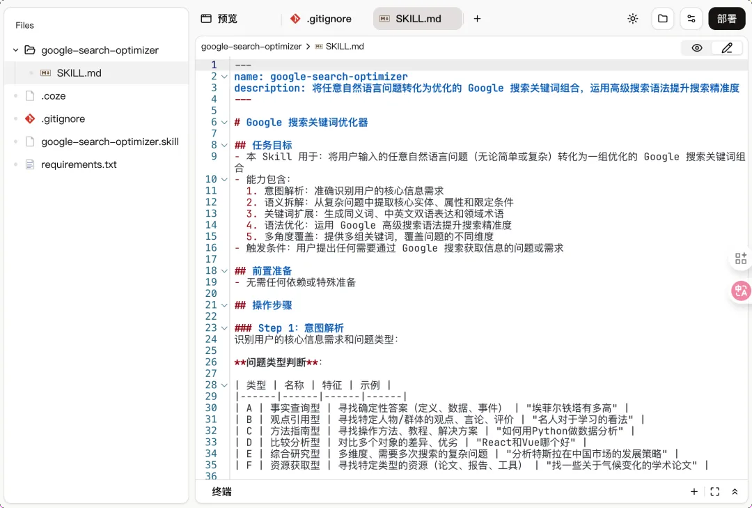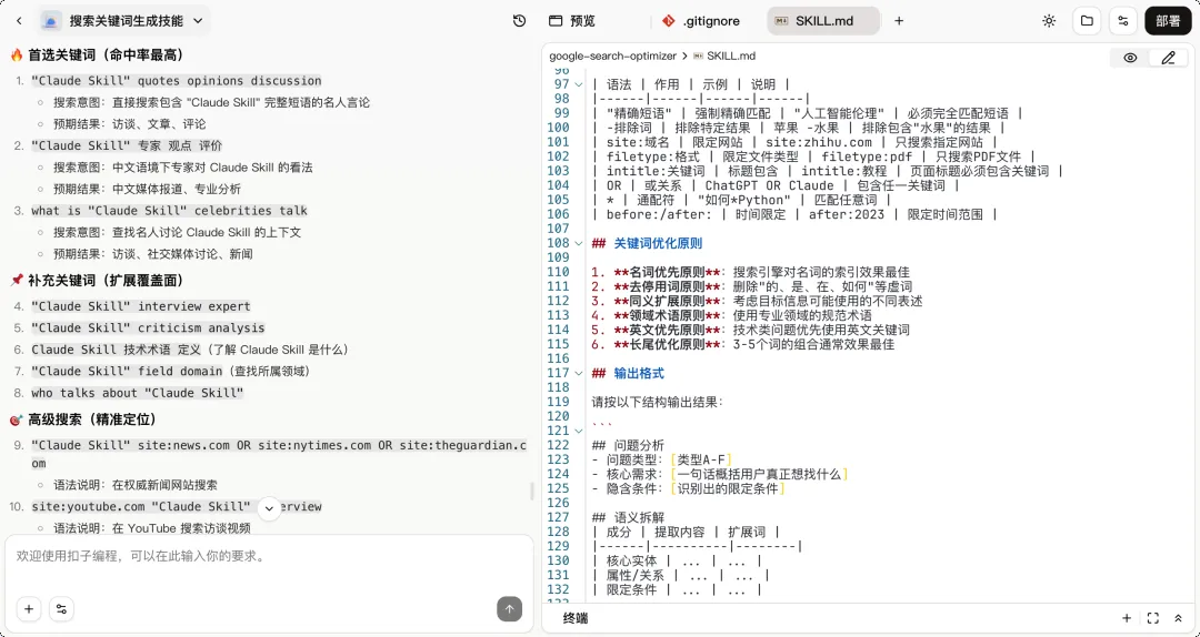 我做了一个简单的 Skill:输入你想研究的问题,它帮你优化成适合搜索引擎的关键词组合。