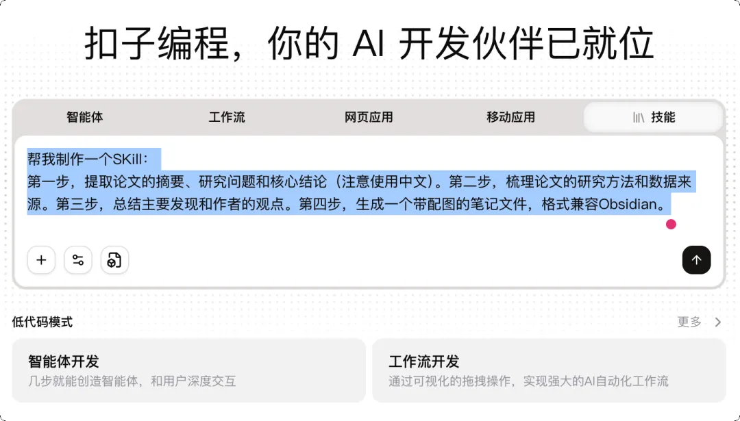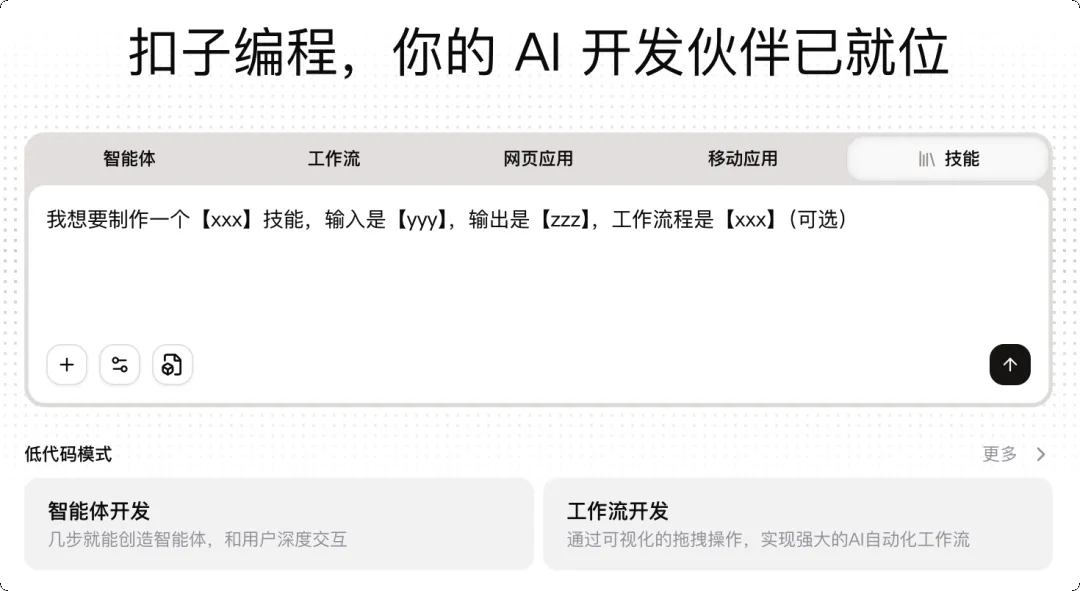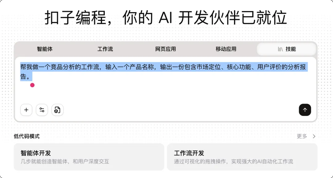 扣子编程已经集成了丰富的 AI 开发能力。你可以用日常语言描述需求,扣子会自动帮你生成智能体、工作流、甚至完整的网页和移动应用。