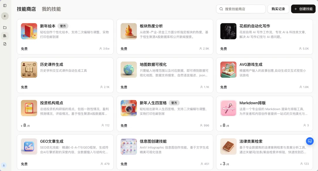 技能商店就是这个生态里的「能力超市」:你可以从商店里一键加载别人的技能使用,也可以把自己的技能打包上架销售。