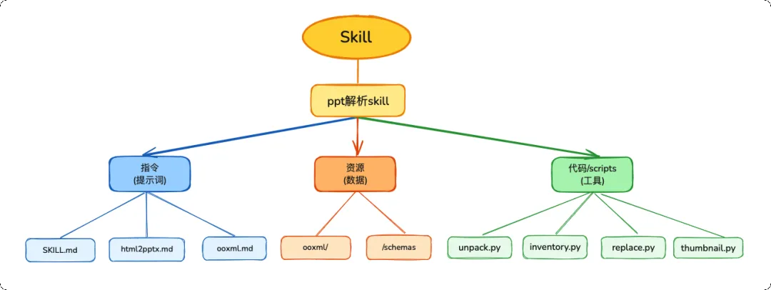 以一个制作 PPT 的 Skill 为例:指令就是告诉 AI 按什么步骤做,代码负责执行其中的固定生成文件逻辑,资源则包含设计标准——比如什么排版好看、什么结构更清晰。