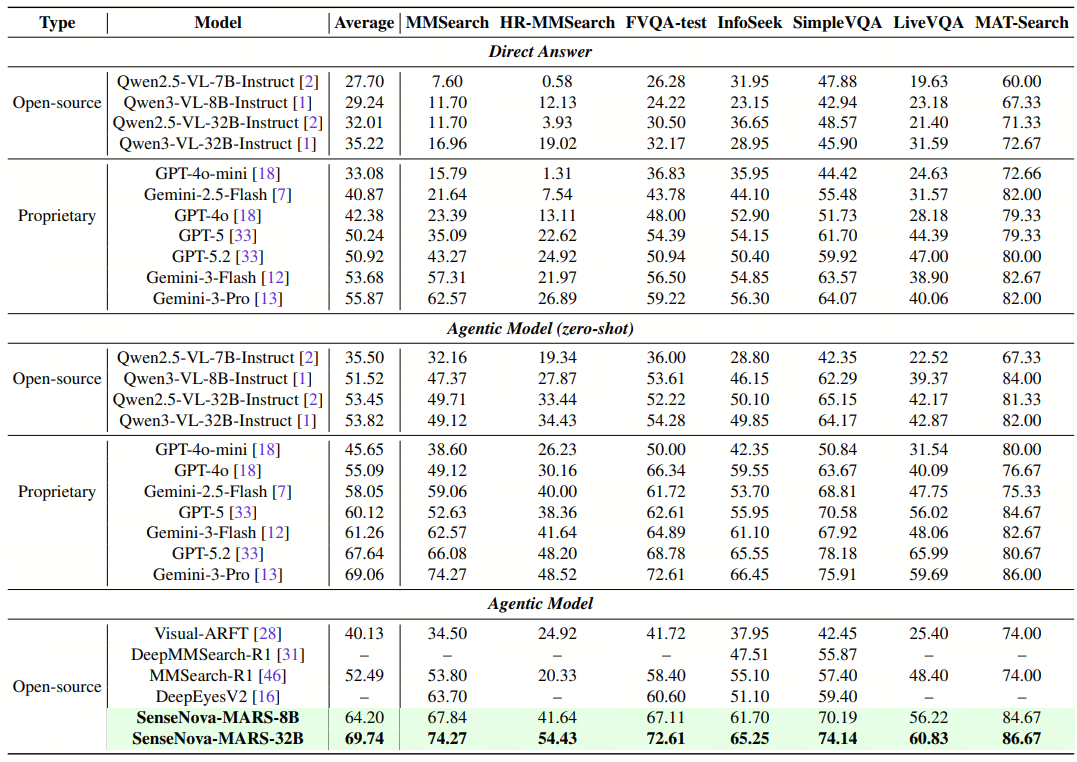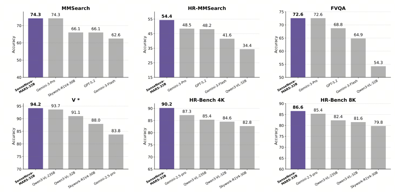 在 MMSearch、HR-MMSearch、FVQA、InfoSeek、SimpleVQA、LiveVQA 等基准测试中,SenseNova-MARS 取得开源模型中的 SOTA 成绩,还超越 Gemini-3.0-Pro、GPT-5.2 等顶级闭源模型,在搜索推理和视觉理解两大核心领域全面领跑。更多细节请参见技术报告(https://arxiv.org/abs/2512.24330),欢迎开发者、各行业用户测试与体验。