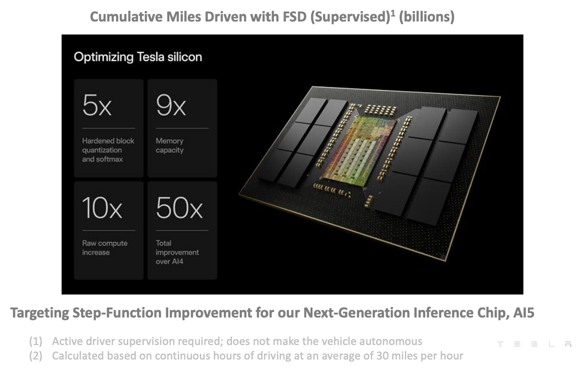 特斯拉下一代自动驾驶车端芯片 AI5 的设计目标 | 图源:业绩报告