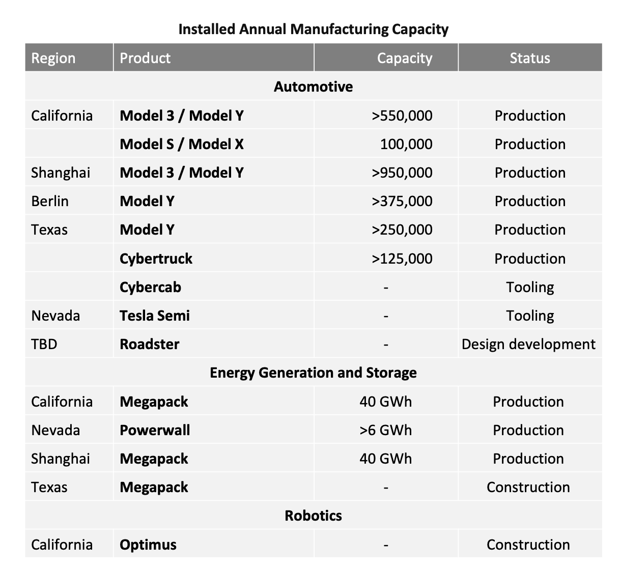 特斯拉目前的产能规划 | 图源:业绩报告