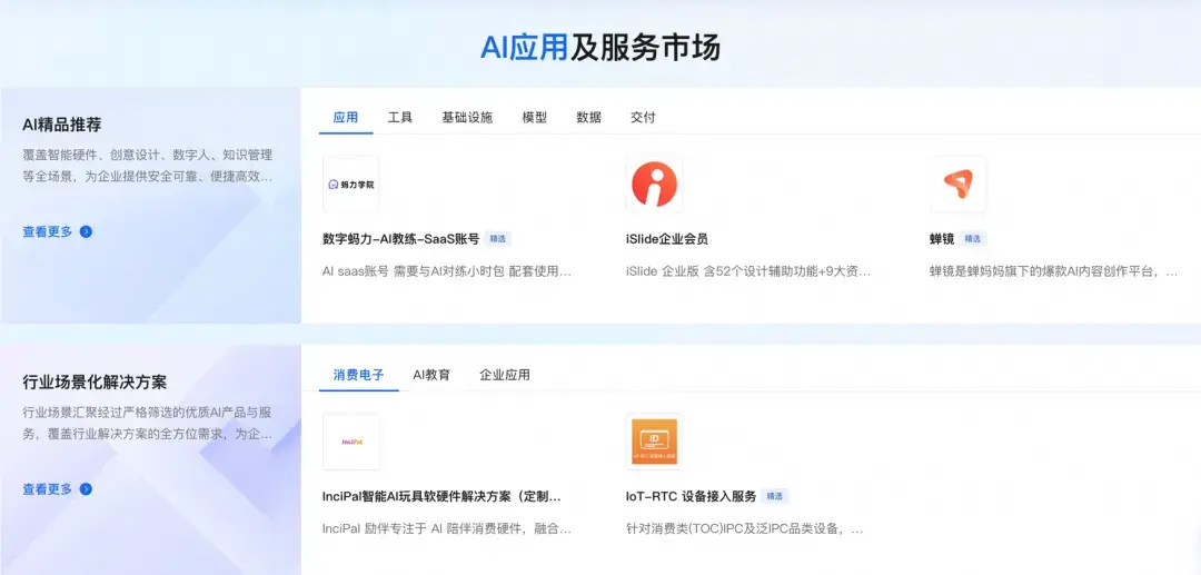 对于 AI 应用场景企业,阿里云云市场推出「AI 应用及服务市场帮助企业快速定位场景与技术服务伙伴。