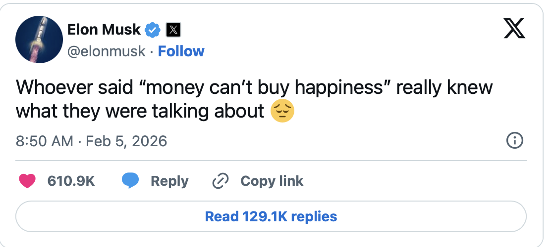 2 月 7 日,据快科技,全球首富伊隆·马斯克日前在社交平台 X 发布了一条引发热议的推文:「Whoever said 'money can't buy happiness' really knew what they were talking about」,并附上了一个悲伤的表情符号。这句话翻译过来就是:「谁说的『有钱也买不到幸福』,真是太对了!」