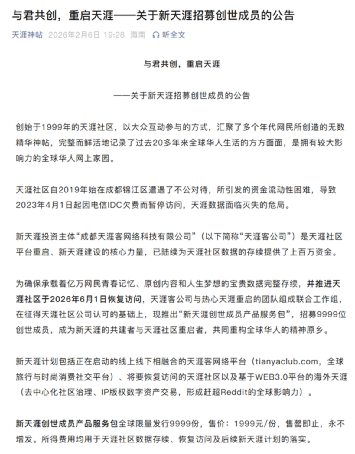 天涯客公司在征得天涯社区公司认可的基础上,推出「新天涯创世成员产品服务包」,招募 9999 位创世成员,成为新天涯的共建者与天涯社区重启者。
