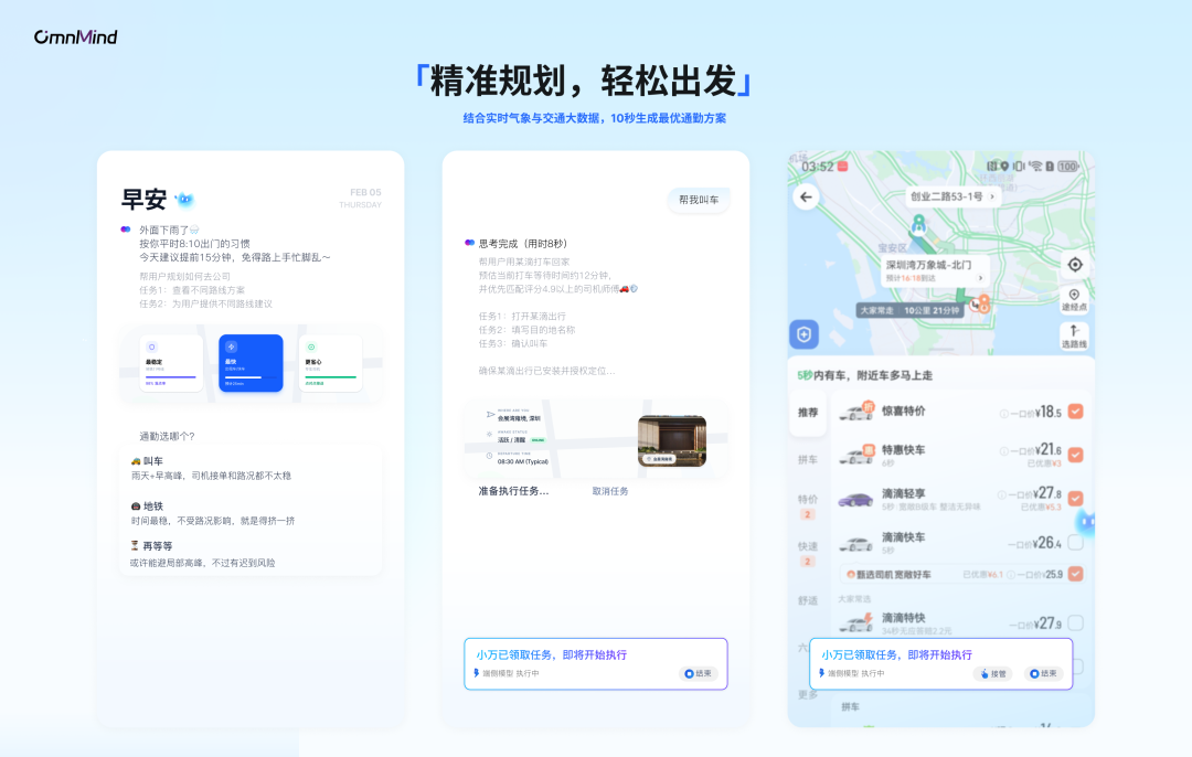 这些上下文被脱敏后发送给 云端,云端大脑迅速规划出一条避开拥堵的打车方案,并决策出「需要提前出发」。