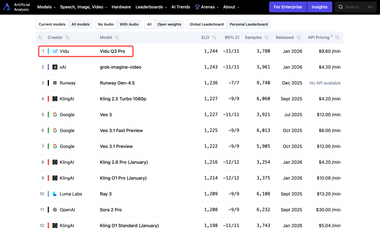 Vidu Q3 全球屠榜,击败马斯克 xAI Grok、 OpenAI Sora、Google Veo 3,登顶 Artificial Analysis 榜首