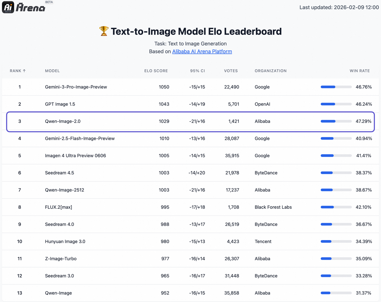 2 月 10 日,阿里巴巴正式发布新一代图像生成及编辑模型 Qwen-Image-2.0。作为千问大模型的图像生成模型底座,Qwen-Image-2.0 集生图和编辑于一体,在 AI Arena 文生图评测中斩获 1029 分,超过 Seedream4.5、Flux2-Max 等模型,仅次于谷歌 Nano Banana Pro 和 GPT Image1.5。Qwen-Image-2.0 支持 1K token 的超长文字输入和 2K 高分辨率,可准确渲染复杂指令,轻松生成专业的 PPT 及信息图,质感媲美专业级摄影师;同时,千问新模型拥有极强中文汉字渲染能力,数百字的古文全文几乎都能完全渲染在图片中。