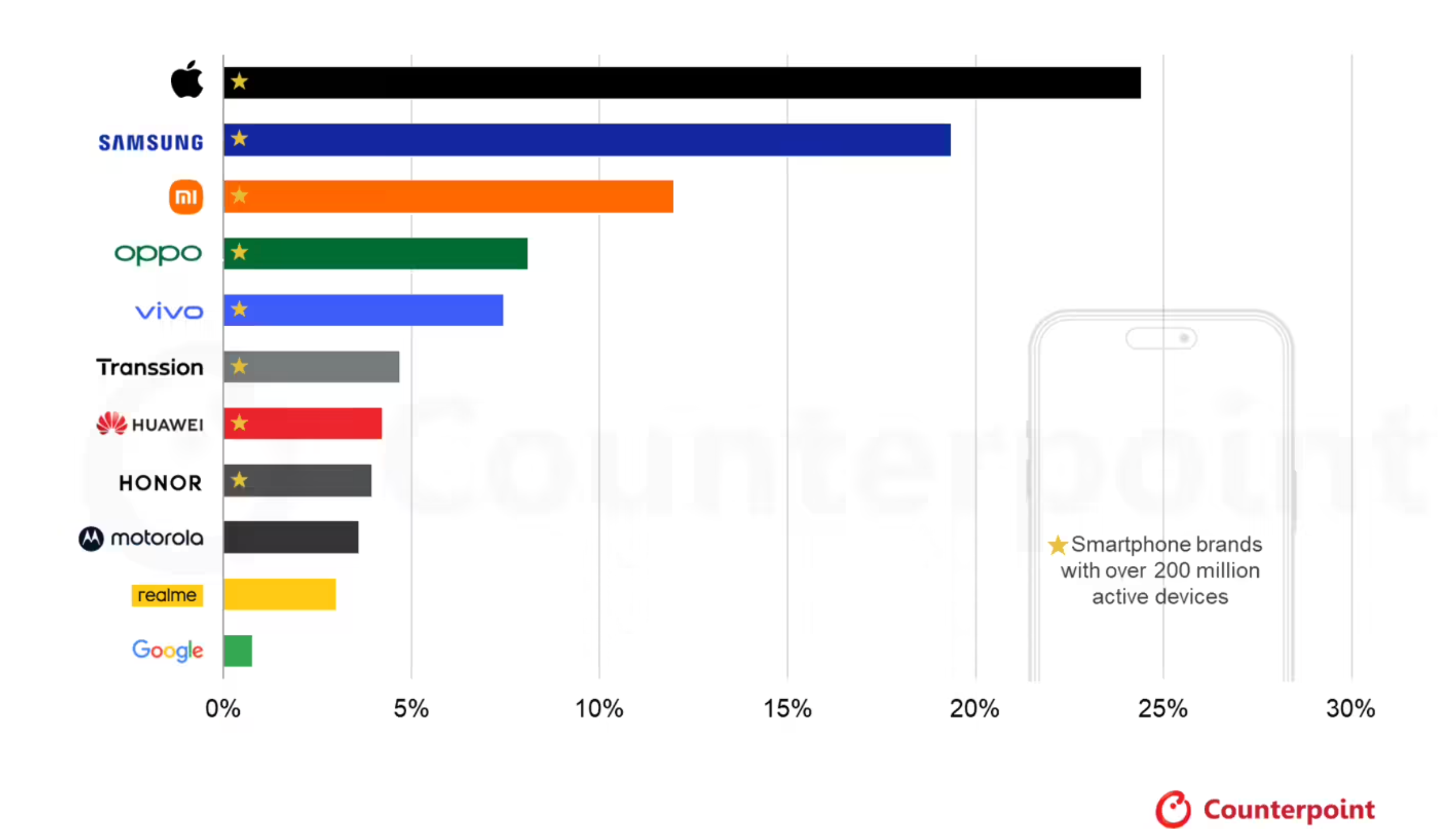 CounterPoint 报告 2025 全球手机存量:8 大品牌破 2 亿,苹果三星断层领先