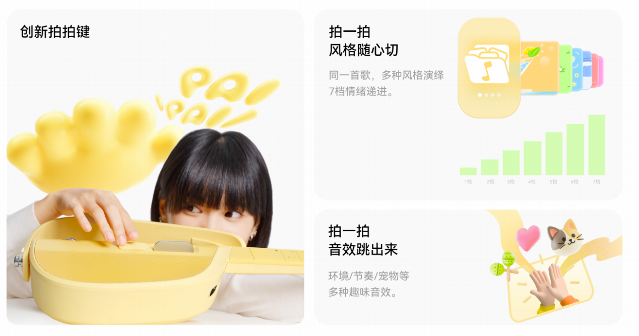 创新“拍拍键”设计成为U1的一大特色。拍一拍即可实现7档情绪递进的风格切换,同一首歌能演绎出多样韵味——开心时弹一段轻快的节奏,低落时奏一曲舒缓的旋律,情绪有了出口;同时还能触发环境、节奏、宠物等多种趣味音效,让音乐创作充满互动乐趣,驱散独处时的孤单。