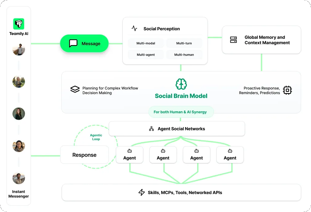 最典型的代表,是 Teamily AI。它是全球首个 AI 社交通用平台,作为一个 AI-native 的即时消息应用,它的核心是借助社交大模型出发以及 agentic social network,可以让人类和 AI 代理实时共存、互动(网页为主,暂无 APP 形态)。