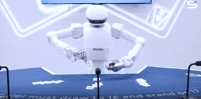 以 21 点发牌为例,Sharpa 的 North 机器人,在 CES 上,能够独立担任发牌荷官,在完全无人情况下连续陪观众打牌。
