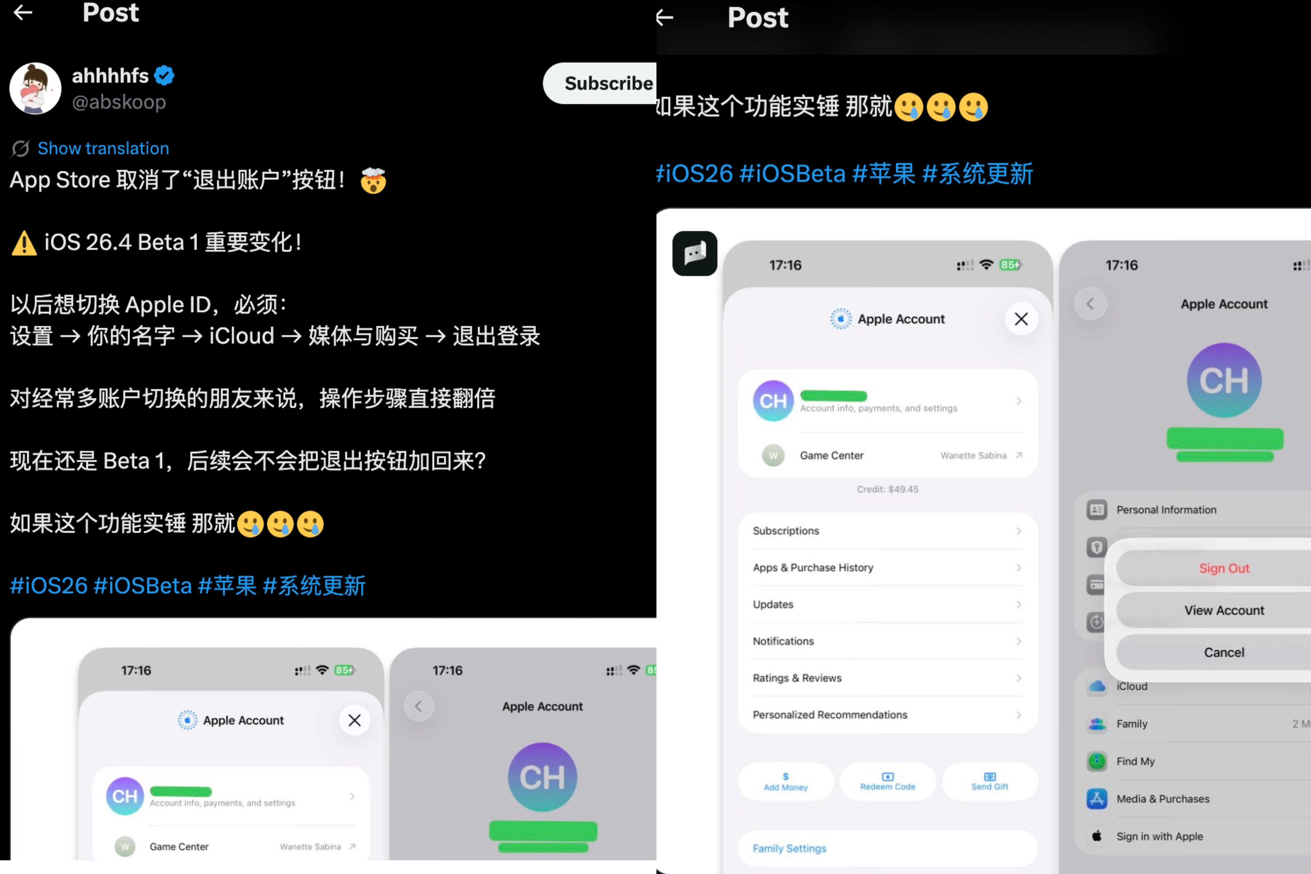 后续有用户发现,苹果在 iOS 26.4 Beta 1 测试版本中调整了账户切换流程,移除了 App Store 原有的账户退出功能,现在必须转到设置里才能切换账户。